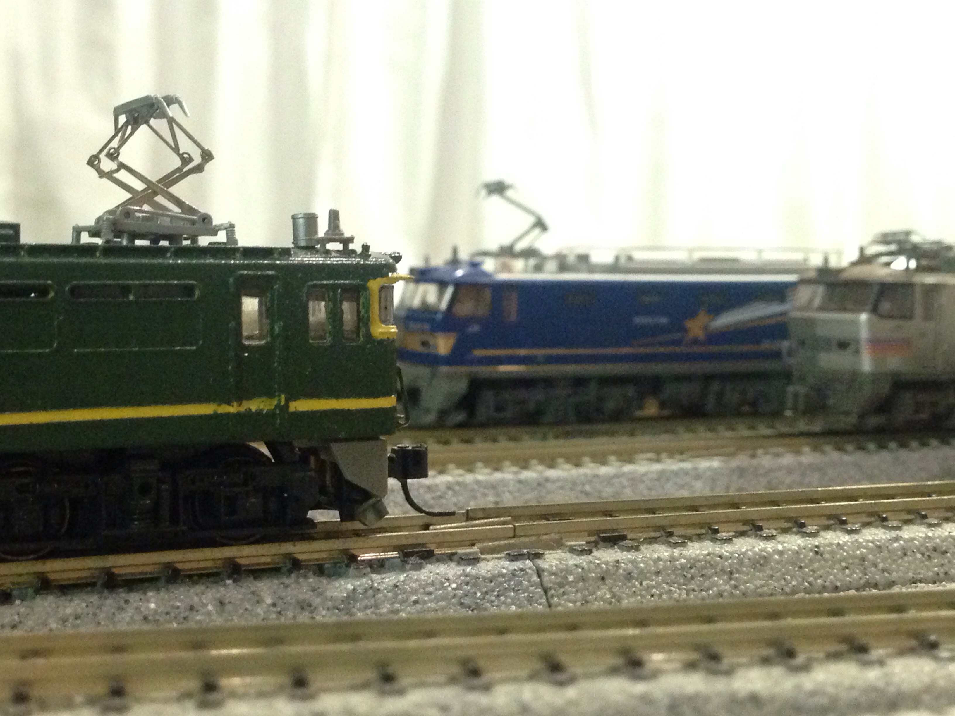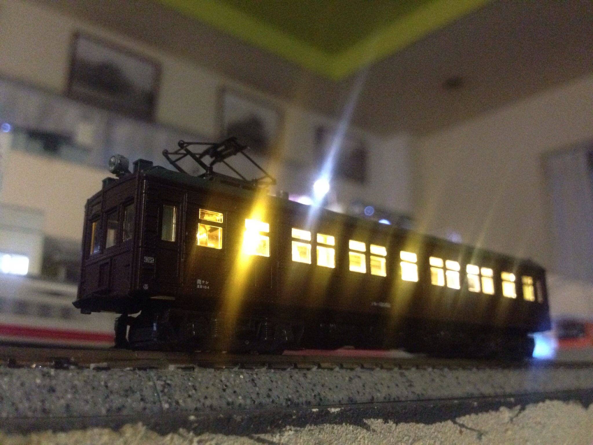スタンリットグリーンの衣をまとった第8713編成です。テストショットということで床下はまだ実物通りではありませんが、車体と電気系統は仕上がっておりました。