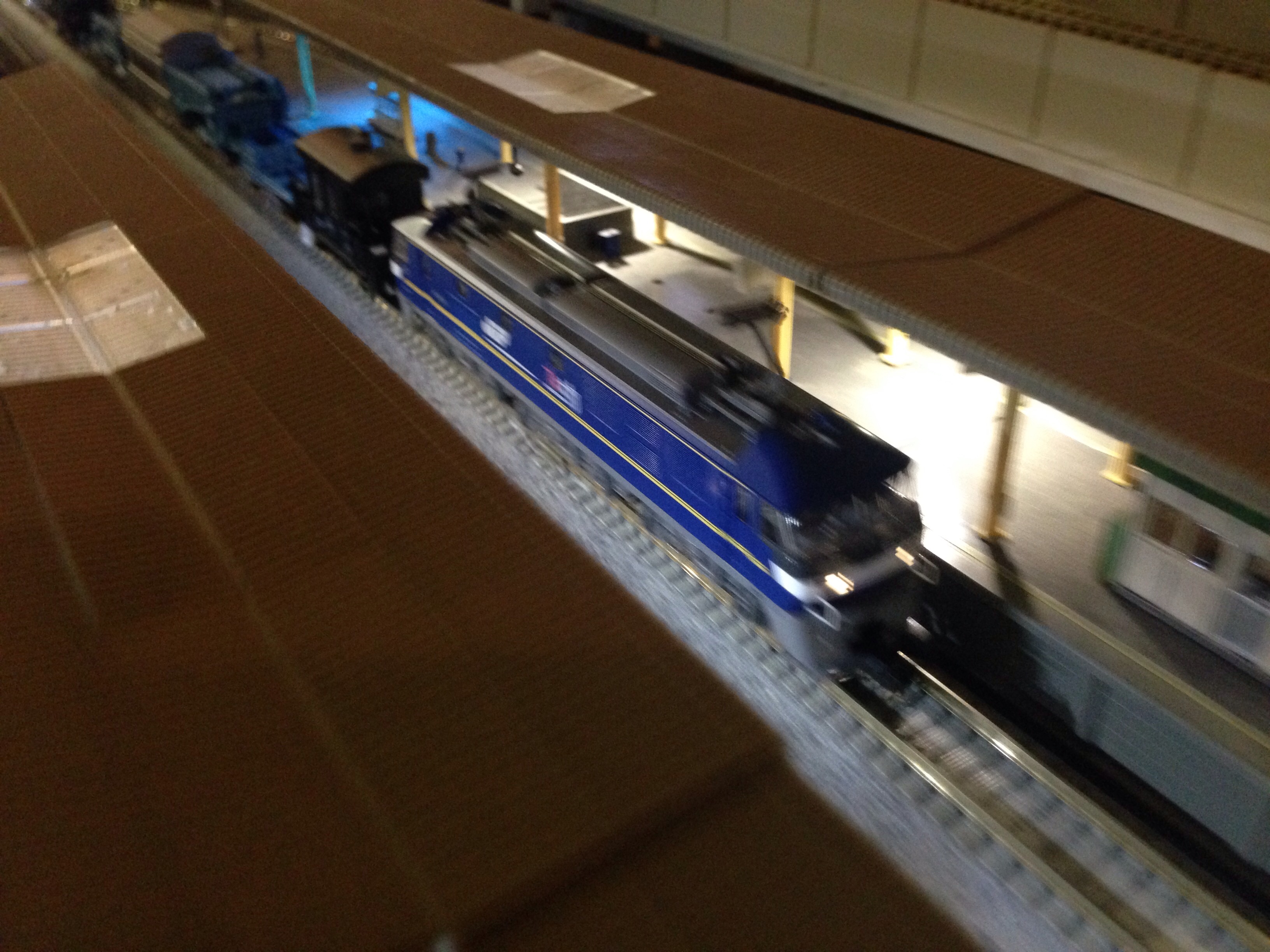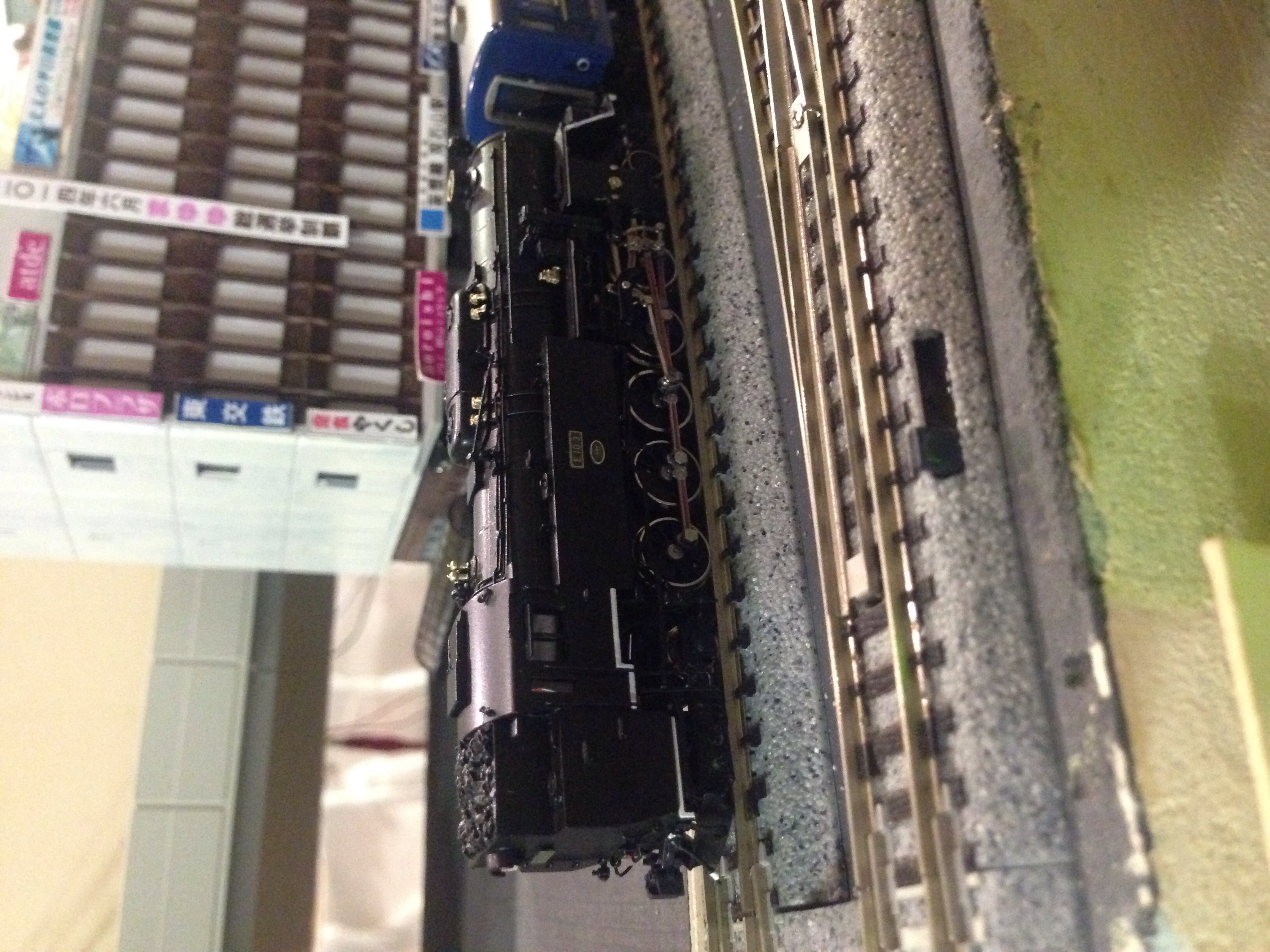 写真が横向きで失礼!E10というSLです。実物は5両しか作られていなくて全国でも青梅鉄道公園にしか保存されていないレア車です。いつも面白い模型を持ち込んでくださる多摩市在住のMさんが、無理して購入したと言われるトレインショップの模型です。同社の製品は出来もよく見栄えもいいので私も憧れてしまいます。